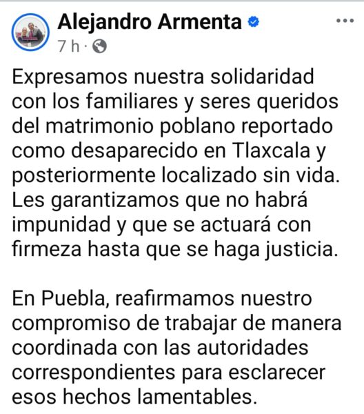 “Expresamos nuestra solidaridad con los familiares y seres queridos del matrimonio poblano reportado como desaparecido en Tlaxcala y posteriormente localizado sin vida. Les garantizamos que no habrá impunidad y que se actuará con firmeza hasta que se haga justicia.
