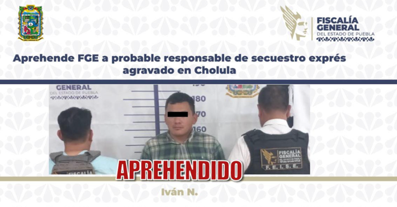 Como resultado de actos de investigación, la Fiscalía General del Estado de Puebla (FGE) cumplimentó una orden de aprehensión en contra de Iván N., de 33 años, por su probable responsabilidad en el delito de secuestro exprés agravado para cometer robo y extorsión, actos acontecidos en el municipio de San Pedro Cholula.