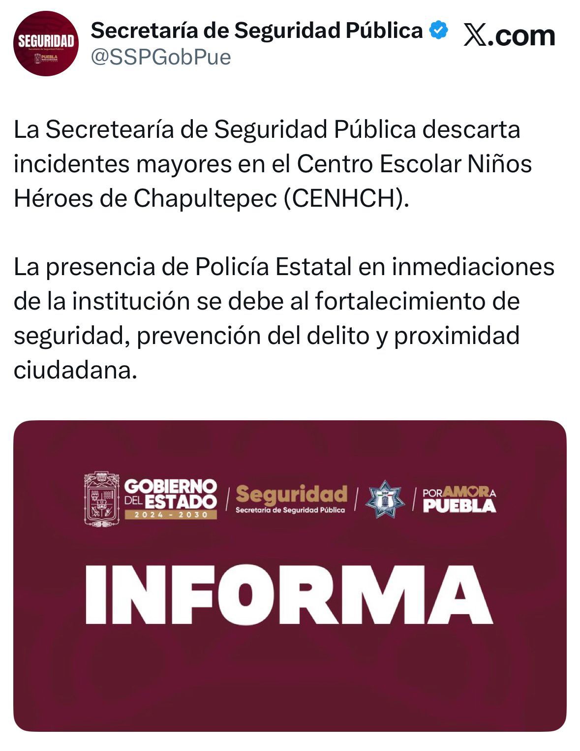 El secretario de Seguridad Pública de Puebla, Francisco Sánchez González, confirmó que los recientes reportes de supuestos tiroteos en planteles educativos han sido falsos, aunque han provocado temor entre la población.