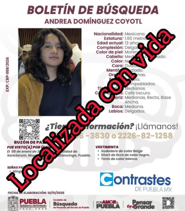 La Fiscalía General del Estado informa que fue localizada Andrea N., reportada como desaparecida en el municipio de Cuautlancingo, Pue.