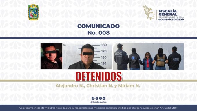 La Fiscalía General del Estado (FGE) de Puebla logró la detención de tres personas presuntamente implicadas en el asesinato del matrimonio conformado por Karina Ruiz y Alexandro Tello, cuyos cuerpos fueron hallados el pasado 20 de febrero en la franja limítrofe entre Puebla y Tlaxcala.