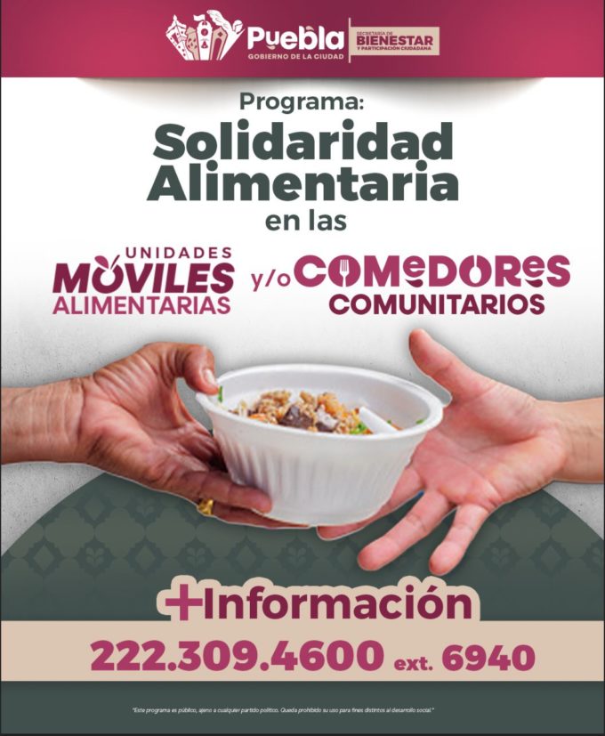 - Puebla, Pue., 14 de abril de 2026.– el Gobierno de la Ciudad de Puebla que encabeza el presidente municipal, Pepe Chedraui, a través de la Secretaría de Bienestar y Participación Ciudadana, emitió la convocatoria del programa “Solidaridad Alimentaria en las Unidades Móviles Alimentarias y/o Comedores Comunitarios”, con el propósito de respaldar los espacios que diariamente brindan alimentos a personas en situación de vulnerabilidad en el municipio.