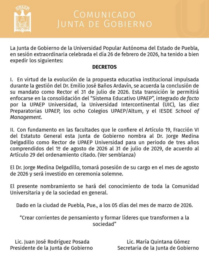 La Junta de Gobierno de la Universidad Popular Autónoma del Estado de Puebla (UPAEP) informó que el Dr. Emilio José Baños Ardavín concluirá su gestión como rector el 31 de julio de 2026, fecha en la que se concretará el cambio en la rectoría de la institución.