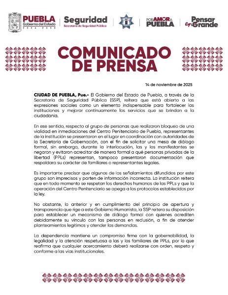 Finalmente, la SSP de Puebla, reiteró su disposición para establecer un mecanismo de diálogo formal con quienes acrediten debidamente su vínculo con las personas en reclusión.