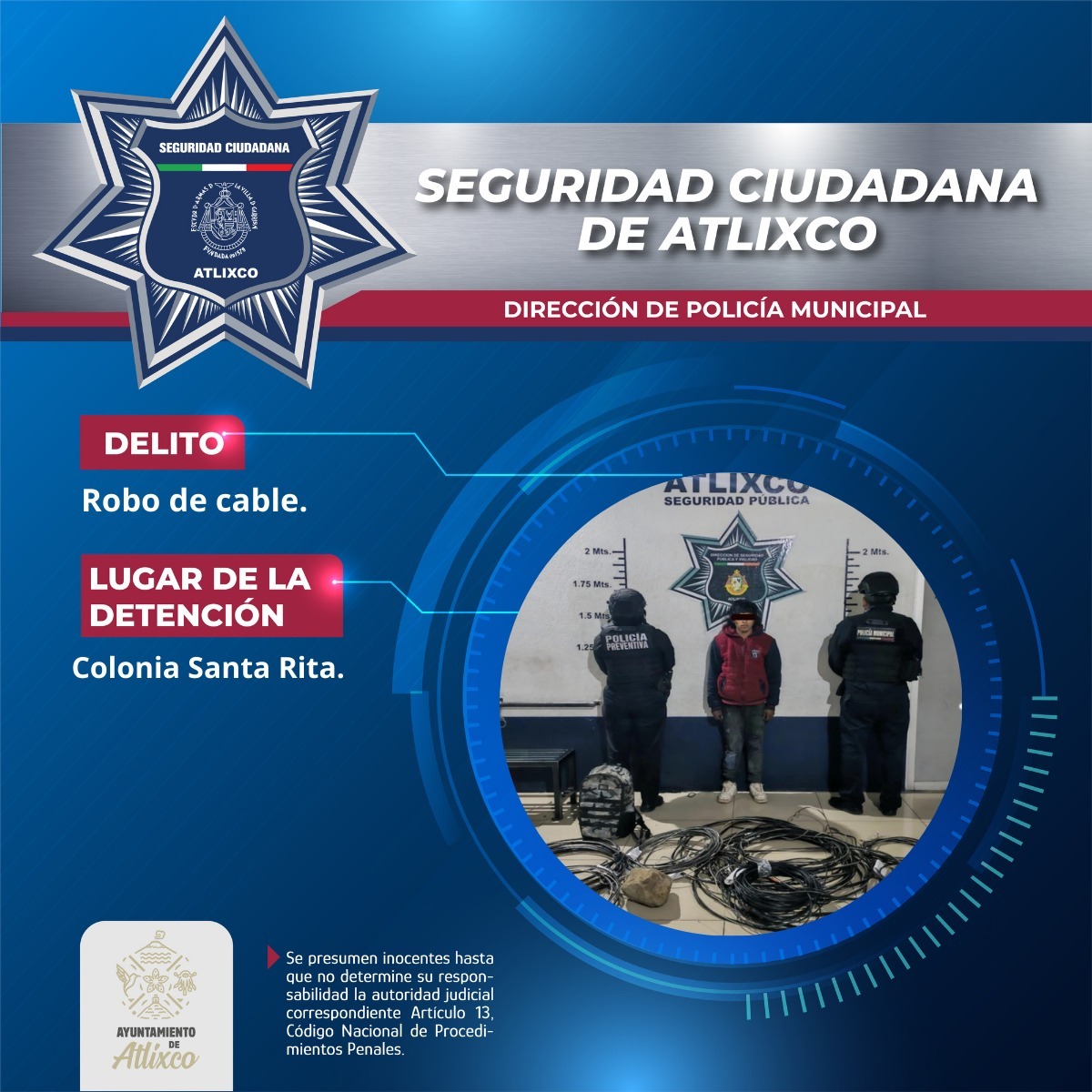 Elementos de la Secretaría de Seguridad Ciudadana de Atlixco detuvieron a un masculino de 19 años por su probable participación en el delito de robo de cable de alumbrado público en el camino al Mercado de Santa Rita.