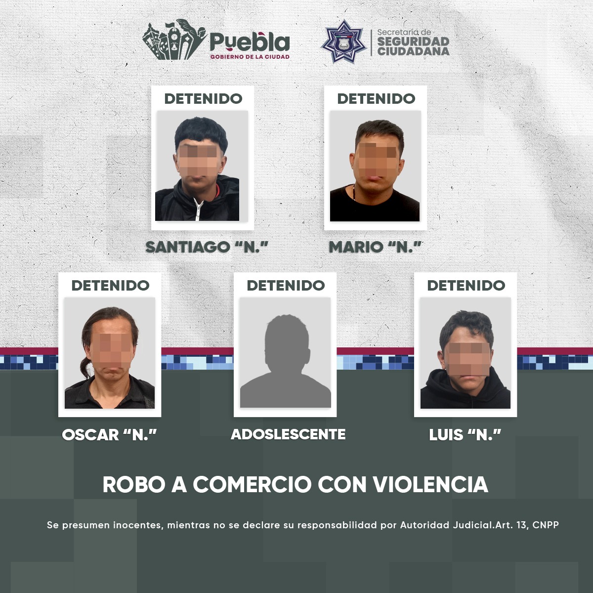 El Gobierno de la Ciudad que encabeza el presidente municipal, Pepe Chedraui, a través de la Secretaría de Seguridad Ciudadana (SSC), derivado de la reacción inmediata, logró la detención de cinco personas en calles del Centro Histórico, luego de que presuntamente asaltaron con violencia una gasolinera de la colonia Santa Cruz Los Ángeles.